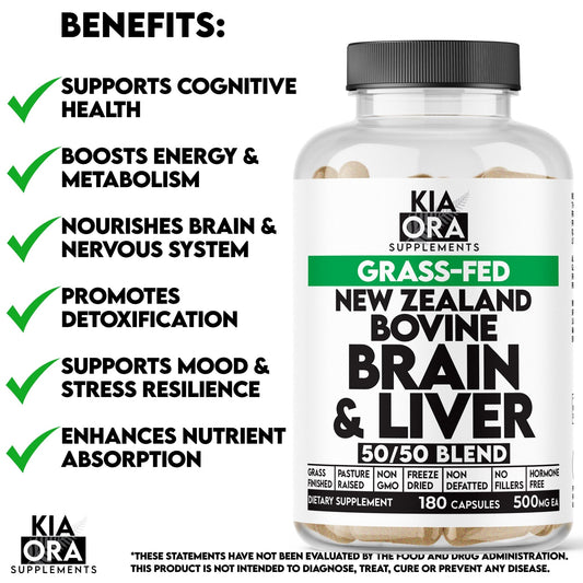 Kia Ora Supplements Brain & Focus | Grass-Fed Bovine Brain & Liver | 180 Capsules