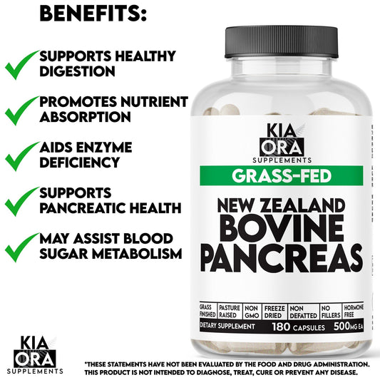 Kia Ora Supplements Pancreas Enzyme Support | 100% Grass-Fed Bovine Pancreas | 180 Capsules