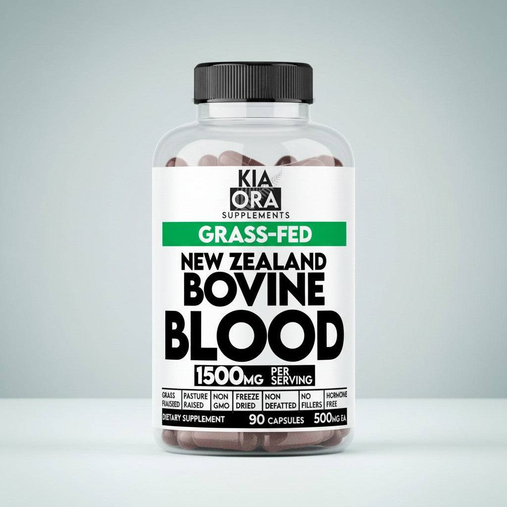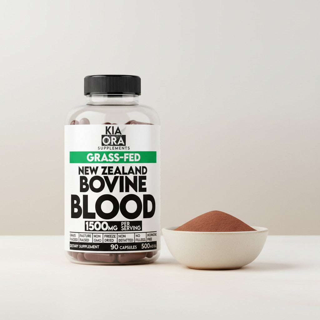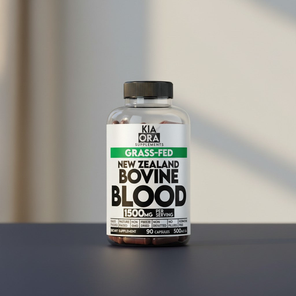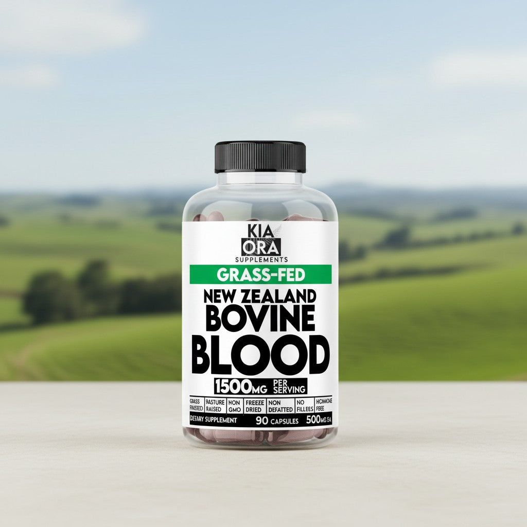 Our New Zealand grass-fed bovine blood capsules deliver whole blood organ nutrition sourced from 100% grass-fed, pasture-raised New Zealand cattle and freeze-dried to preserve naturally occurring heme iron, whole blood proteins, organ-specific peptides, and structural compounds within the complete biological matrix of the tissue.